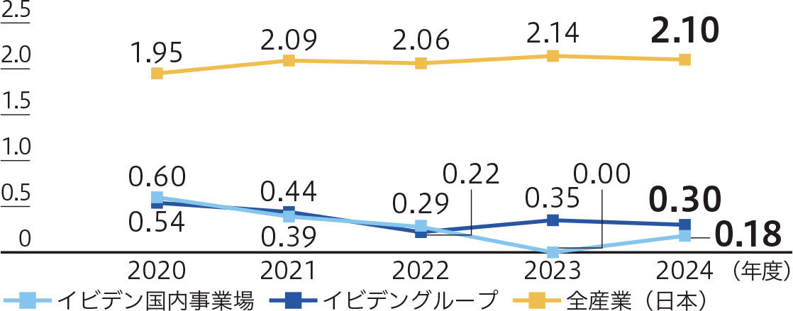 当社グループでは中期目標として2027年度までに「重大災害ゼロ」を継続するとともに、労働災害度数率0.10以下とすることをめざしています。「再発労災のゼロ化」、「新規災害の未然防止」を活動の柱として、イビデングループ全体として全員が「安全第一」を自覚し、安全で快適な職場を築き、ハツラツと働くことができるよう労働安全衛生活動に取り組んでいます。結果として、2024年度も請負業者含め当社グループの全従業員のうち、死亡災害および障害の残るような重大災害は発生していません。また、当社グループの2024年度の労働災害度数率は0.30と、日本国内の全産業平均を下回る水準にあります。労働災害が発生した場合は、「イビデン安全衛生環境基準」に従い、上司や職場への連絡、二次災害を防ぐ処置の実施といった対応を迅速に行います。